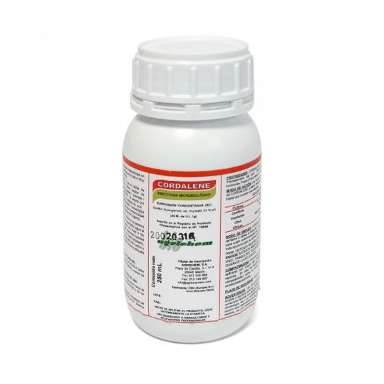Cuando una larva o gusano consume una cantidad de producto suficiente y letal su sistema digestivo que fatalmente afectado por lo que dejan de alimentarse y se limitan a quedarse sobre el follaje hasta que mueren unos días después. Como ya no pueden comer, desde el momento que se infectan por Cordalene, aunque aguanten unos días más, ya no son un peligro potencial. Cordalene está formulado biológicamente a base de Bacillus Thuringiensis variedad Kurstaki transconjugado de manera natural con variedad Aizawai de la cepa EG 2348. Es una suspensión concentrada con una eficacia de 24 millones de U.l./gr contra Trichoplusia y de 33,5 millones de U.l./gr contra Helicoverpa armígera lo que hace de él una de las opciones bioinsecticidas más eficaces del mercado contra gusanos y similares. Estas son algunas de las especies que combate con efectividad: Heliotis y otras orugas en hortícolas, procesionaria y otras orugas defoliadoras en pinares y bosques, prays del olivo y de los cítricos, chilo del arroz, lobesia de la vid y muchas otras plagas de los frutales. Instrucciones de uso y aplicación de Cordalene de Trabe Se debe diluir el producto con agua a razón de entre 1.5 y 2 ml por litro de agua. Esto lo decidiremos en función de la importancia de la plaga y del estado de desarrollo. Pulverizar bien por toda la superficie de la planta, haz y envés de hojas también. Es aconsejable empezar a usarlo si lo detectamos justo en el inicio del desarrollo larvario. Cuando tenemos gusanos grandes es aconsejable quitarlos de forma manual. Composición de Cordalene de Trabe: Bacillus thuringiensis cepa EG 2348 24% SC