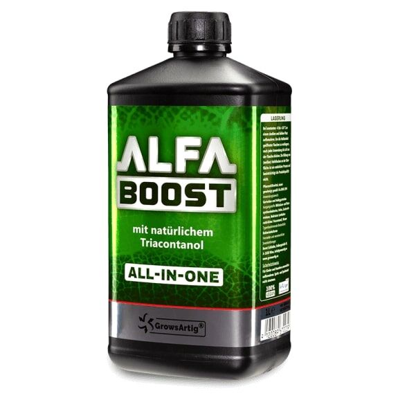 La sustancia activa acelera el metabolismo de la planta y el crecimiento en general. Las semillas germinan más deprisa y los esquejes forman raíces con mayor rapidez. El triacontanol acelera la maduración, acortando al mismo tiempo el período de crecimiento y floración. El uso de Alfa Boost permite reducir la formación de moho y podredumbre, dado que las sustancias orgánicas (como raíces muertas) se degradan, convirtiéndose en sustancias fitoactivas, como enzimas, vitaminas y antioxidantes. Alfa Boost previene pérdidas por podredumbre en las semillas, aumentando la tasa de germinación. Alfa Boost contiene enzimas, que actúan como biocatalizadores, acelerando los procesos fisiológicos en la planta y el suelo. Lo especial de Alfa Boost es que los cultivos de bacterias y enzimas que contiene producen a la práctica enzimas a la carta para la planta, siempre que ésta las necesita. Los microorganismos optimizan la absorción de nutrientes al generar en el suelo compuestos complejos a partir de nutrientes orgánicos y minerales, haciendo este trabajo por la planta. Asimismo, previenen la salinización, o bien eliminan las sales presentes en el suelo. De este modo, se reduce la necesidad de fertilizar en su conjunto. Los microorganismos penetran en la planta a través de las raíces y la superficie, protegiéndola desde dentro. El ácido silícico juega un papel muy importante en el fortalecimiento de las plantas contra parásitos y enfermedades, dado que refuerza la estructura de las células, dificultando la penetración de patógenos. A su vez, el ácido salicílico refuerza y apoya la planta en caso de estrés causado por calor, sequedad o trasplante.