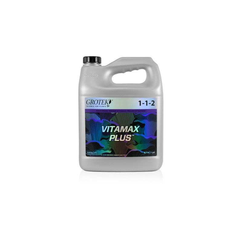 Vitamax Plus de Grotek, con su nueva y mejorada formulación, es un estimulador de crecimiento desarrollado para ayudar a la planta en varias fases, en el enraizado, el desarrollo vegetativo y en la formación de flores y frutos. Obtendremos plantas más sanas y vigorosas durante todo el cultivo. Grotek Vitamax Plus vitaminas y antiestrés. Vitamax Plus de Grotek aporta macronutrientes, magnesio y un conjunto de vitaminas que favorece al desarrollo en floración, reduce el estrés en los trasplantes y condiciones climáticas adversas ayudando así a nuestras plantas a superar las adversidades durante la cosecha mejorando también las defensas naturales contra plagas. Vitamax Plus de Grotek se puede utilizar tanto en mezcla de turbas, en coco, riego por goteo e hidropónico. Añádelo como aditivo a cualquier gama de fertilizantes. Valido tanto para cultivos de exterior como cultivos indoor. Perfecto para combinarlo tanto con Grotek Solotek Grow y Grotek Solotek Bloom. El complejo vitamínico de Grotek lo podrás encontrar en los siguientes envases: Vitamax Plus 500ml. Vitamax Plus 1L. Vitamax Plus 4L. Tus plantas tendrán muchísima energía para desarrollarse en todas las fases del cultivo, siendo más fuertes, más resistentes y mejorando la producción con Vitamax Plus. Como utilizar VITAMAX PLUS de GROTEK: Aplicación en riego para plantas jóvenes: Mezclar 2.5ml Vitamax Plus por cada litro de agua de riego. Aplicación en riego para plantas adultas: Mezclar de 1.25 a 2.5ml de Vitamax Plus por cada litro de agua de riego. Aplicación vía foliar: Mezclar de 1 a 2ml de Vitamax Plus por cada litro de agua (aplicar pulverizado hasta que se formen las primeras flores) COMPOSICIÓN: Nitrógeno total (N): 1.0% Nitrógeno amoniacal: 0.1% Nitrógeno nítrico: 0.9% Fosfato disponible (P2O5): 1.0% Potasio soluble (K2O): 2.0% Magnesio (Mg): 0.5% Magnesio soluble en agua: 0.5% Derivado de: Nitrato de amonio, nitrato de magnesio, sulfato de magnesio, nitrato de potasio y fosfato mono potásico.
