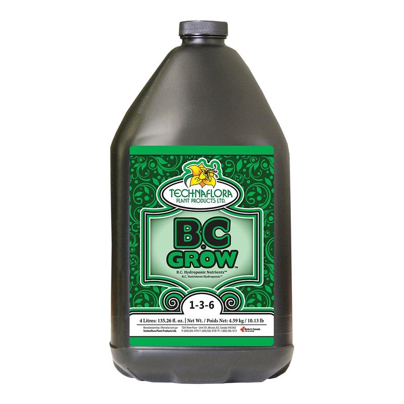 B.C. Grow es un fertilizante base que forma parte de la gama B.C. Hydroponic Nutrients™ de Technaflora. Un fertilizante de tres partes de alta calidad diseñado para promover abundantes cultivos vegetativos y un extraordinario crecimiento floral. Grow, Boost y Bloom son fertilizantes para uso profesional y altamente concentrados. Esta gama de productos es totalmente equilibrada y está diseñada para producir bajos niveles de acumulación de sales en los sistemas de riego y para minimizar la fluctuación del pH. Cualquier combinación de estas tres fórmulas es perfecta todos los medios de cultivo. Los cultivadores pueden reducir de manera substancial el tiempo de limpieza y los gastos, ya que la acumulación de sales u otros resiudos es mínima.