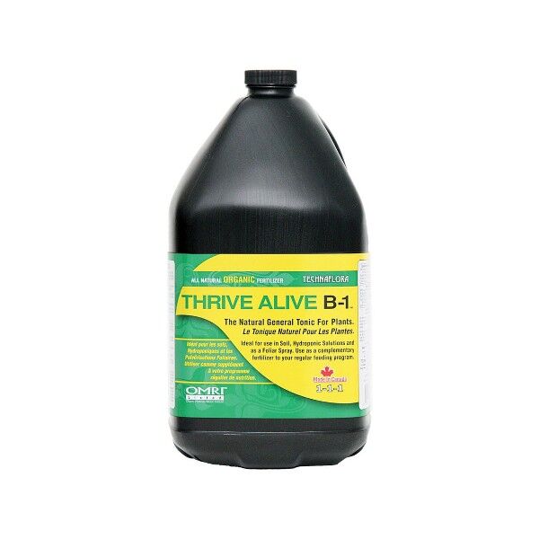 Thrive Alive B-1 Verde es un poderoso tónico preventivo y restaurador de uso general para plantas que promueve el crecimiento vegetativo rápido y exuberante Incluido como producto orgánico en la lista de OMRI®. Su fórmula profesionalmente balanceada contiene vitaminas y nutrientes que se encuentran en algas pardas marinas de primera calidad de Columbia Británica. Es seguro y fácil de usar en todo tipo de cultivos. Facilita el desarrollo radicular vigoroso y saludable para esquejes y sistemas radiculares establecidos, mientras que protege las plantas del estrés relacionado con el transplante. Thrive Alive B-1 Verde puede aplicarse directamente en el suelo o a través de pulverización foliar. Cuando se utiliza semanalmente a través de pulverización durante el ciclo vegetativo y en la primera semana de floración, promueve un efecto de desarrollo vegetativo espectacular.