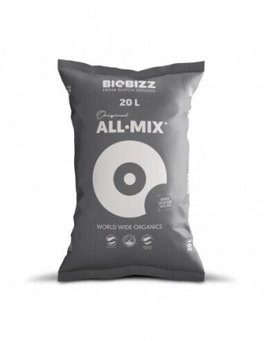 El sustrato a base de tierra All Mix de Biobizz tiene un alto contenido en fertilizante, que permite alimentar las plantas de marihuana durante las primeras semanas tras cada trasplante. Allmix es un sustrato de alta gama elaborado a partir de los siguientes componentes: turba de esfagno, humus de lombriz, perlita y hongos beneficiosos. Conductividad eléctrica = 2.4 mS/cm – pH = 6.6 (método 1:1.5) – Nitrógeno: 133 ppm – Fósforo (P2O5): 29 ppm – Potasio (K2O): 289 ppm Cuando cultives con los productos Biobizz, la cantidad de abono que se suministra a las plantas varía en función del sustrato utilizado. En nuestra guía de cultivo puedes consultar las distintas dosis en la tabla de cultivo Biobiz