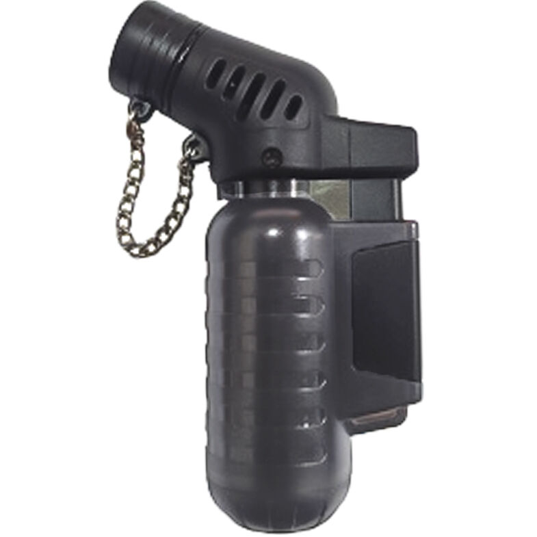 Mechero de la marca Qbak tipo Soplete, encendido electronico, con tapa de seguridad, recargable, trasparente para poder ver la cantidad de gas restante, color Gris. Por su tamaño reducido perfecto para llevar encima.